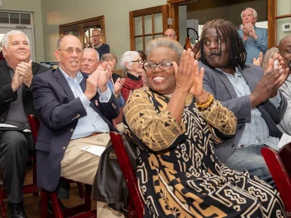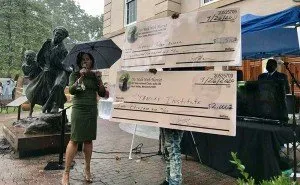 During a community meeting in September to discuss bringing a sculpture permanently to Cambridge, Linda Harris surprised the crowd by presenting donations to the Harriet Tubman Museum and the Stanley Institute. She recently had completed a trek walking the Harriet Tubman Byway and told the group she is committed to helping with their endeavor.